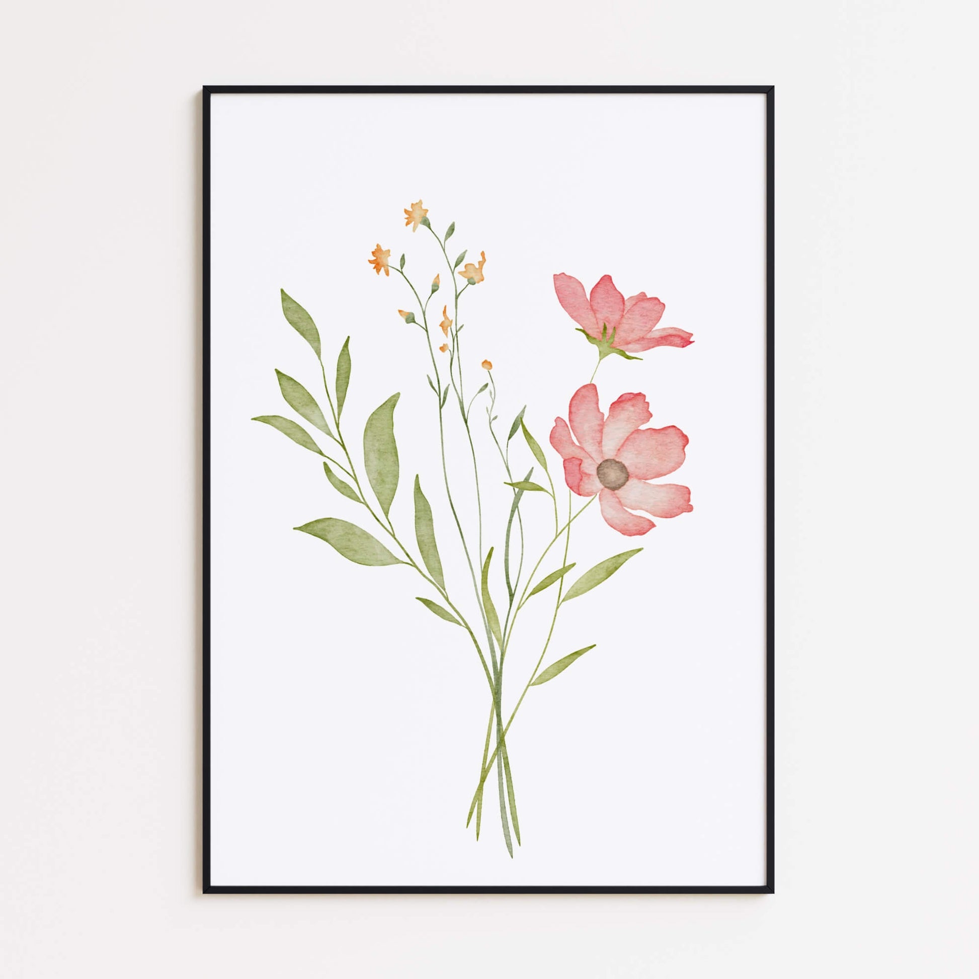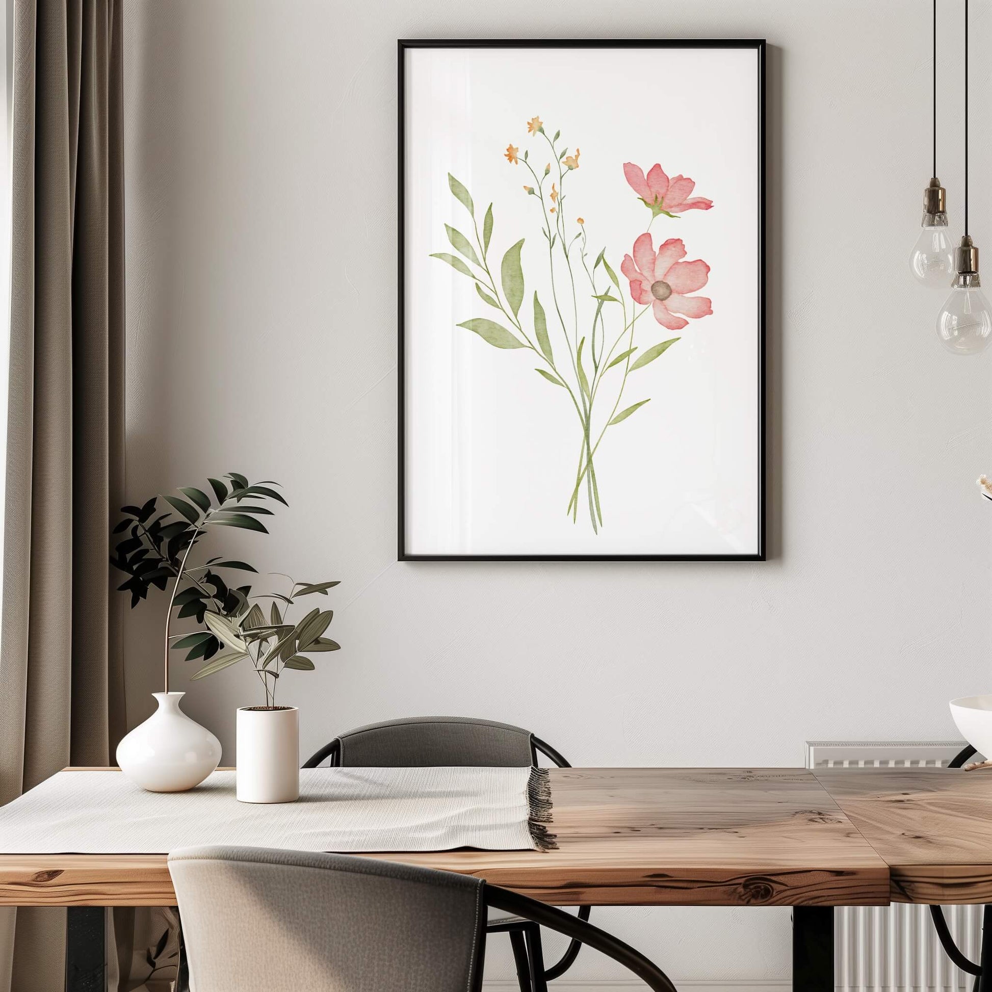 Dieses druckbare Poster zeigt einen bezaubernden Strauß Kosmosblüten in zarten Rosatönen, gepaart mit üppigem Grün. Sein minimalistisches und elegantes Design verleiht jedem Raum eine beruhigende Note.