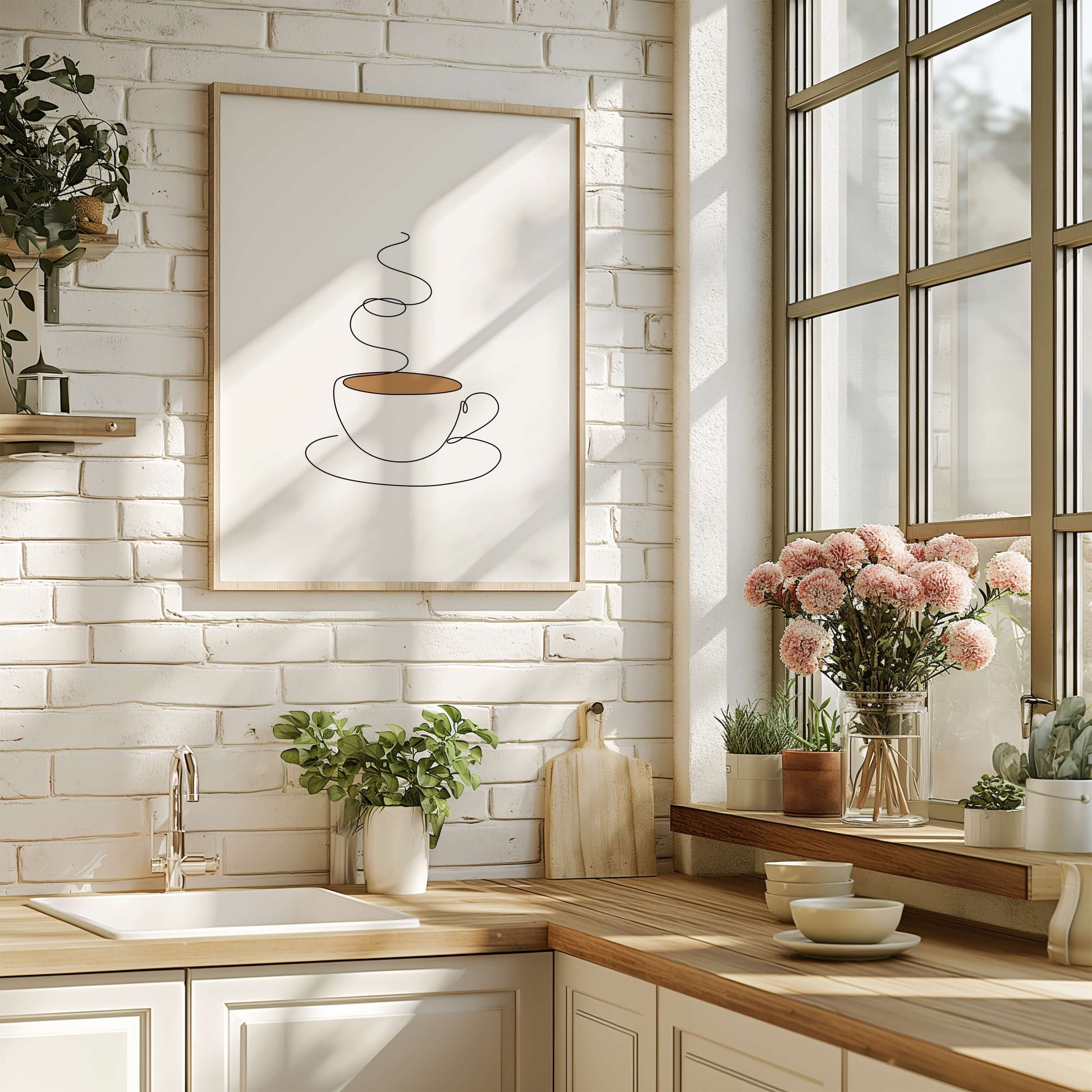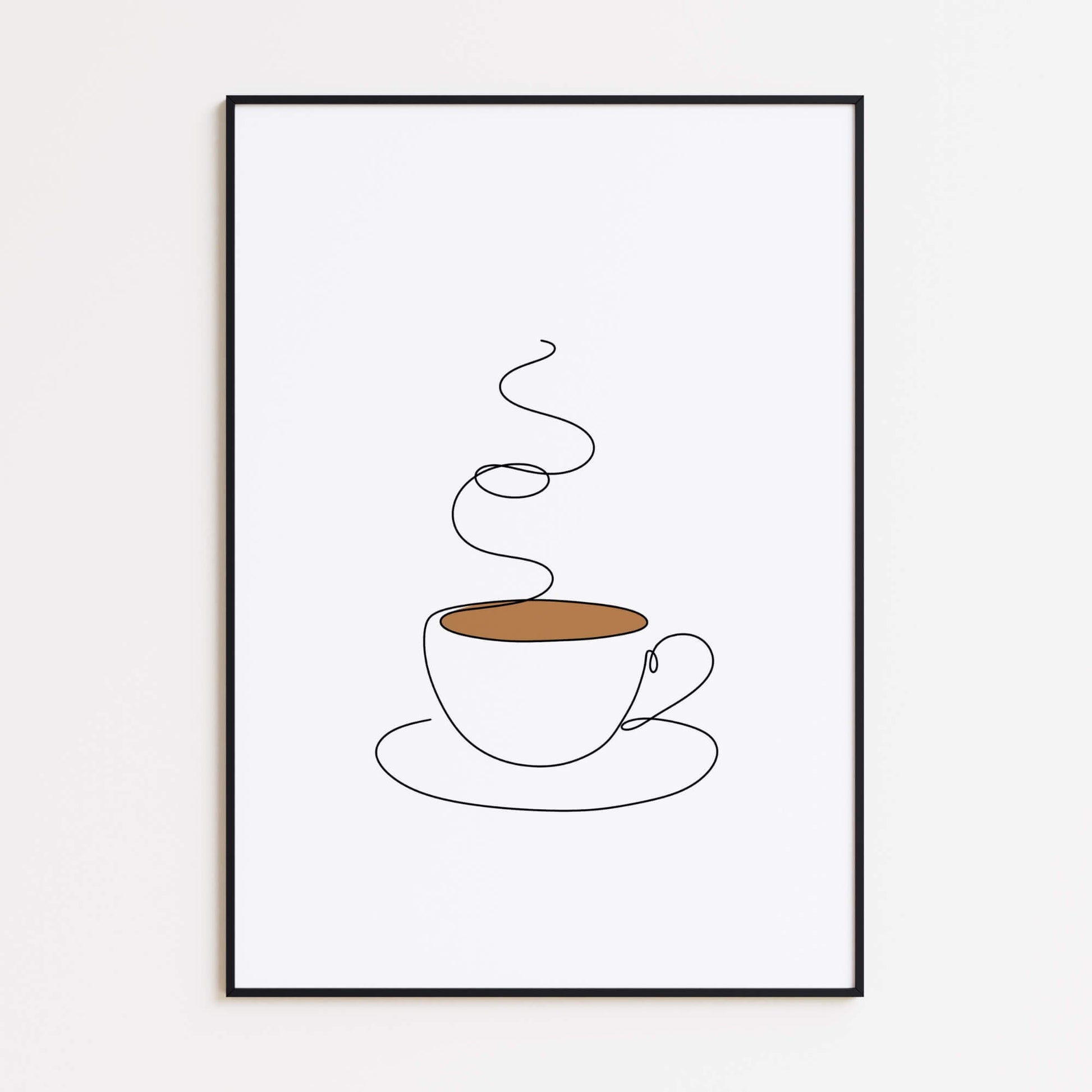 Dieses minimalistische Poster zeigt eine einzeilige Illustration einer dampfenden Espressotasse, akzentuiert mit warmen Brauntönen. Das klare und moderne Design ist perfekt für Kaffeeliebhaber und verleiht Küchen, Cafés oder Kaffeeecken eine gemütliche und zugleich stilvolle Note. Kombinieren Sie es mit anderen Kaffeemotiven für eine charmante Bilderwand.
