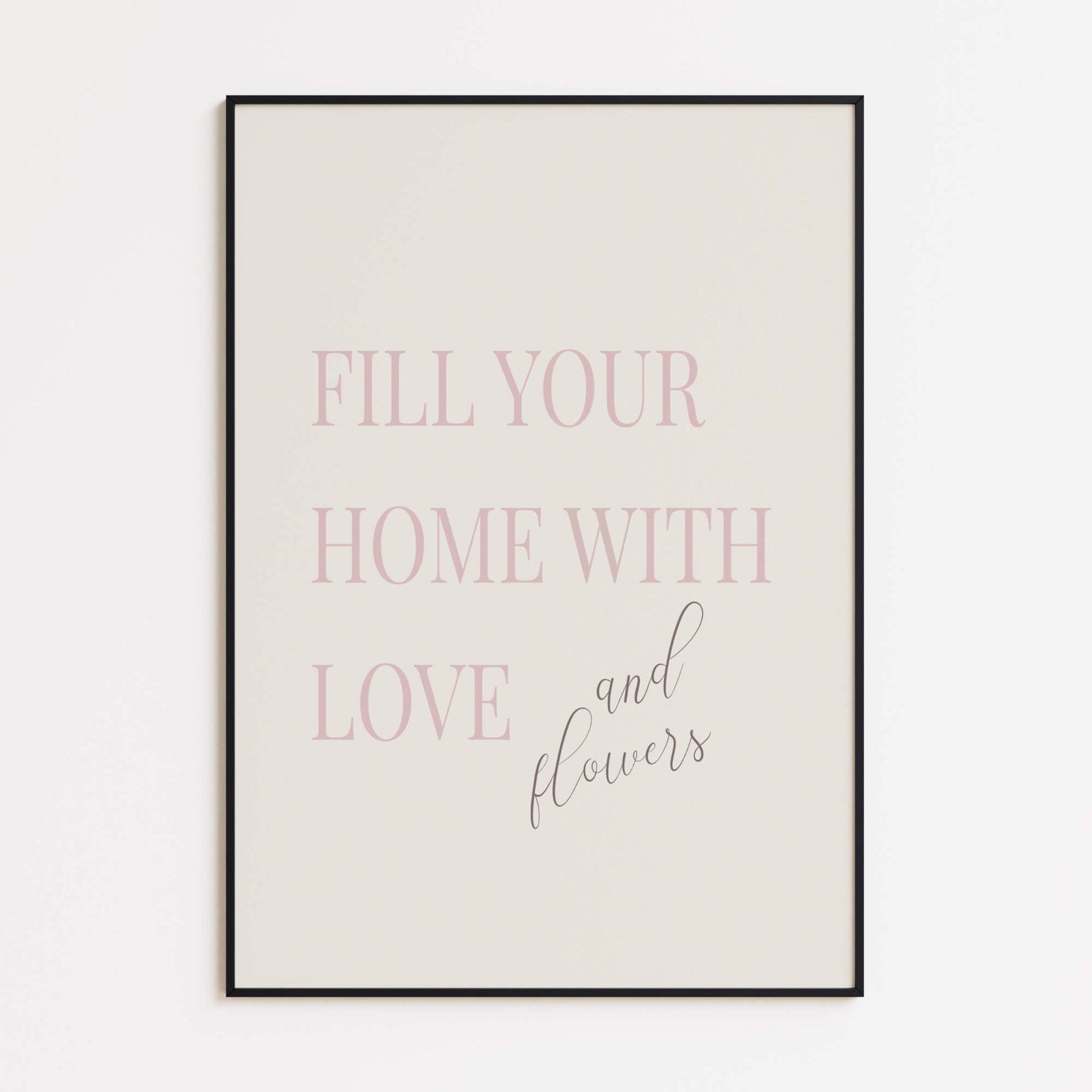 Verleihen Sie Ihrem Raum mit diesem eleganten Typografie-Poster einen Hauch von Charme und Wärme. Der Satz „Fill Your Home with Love and Flowers“ ist wunderschön in sanften, neutralen Tönen gestaltet und passt perfekt in jeden Raum. Ideal für eine gemütliche und einladende Atmosphäre, passt dieser Druck wunderbar zu floralen Dekorationen oder anderen inspirierenden Kunstwerken.