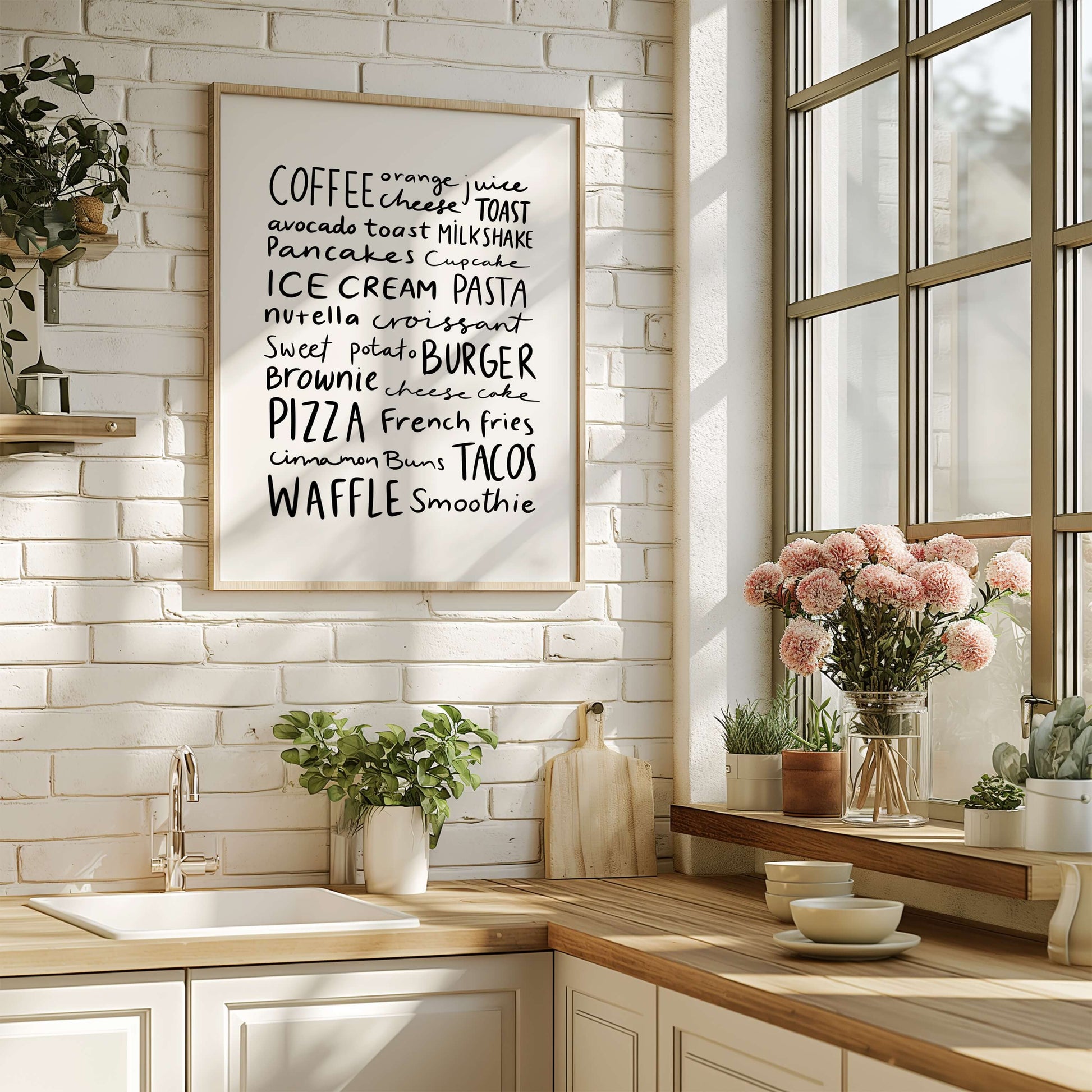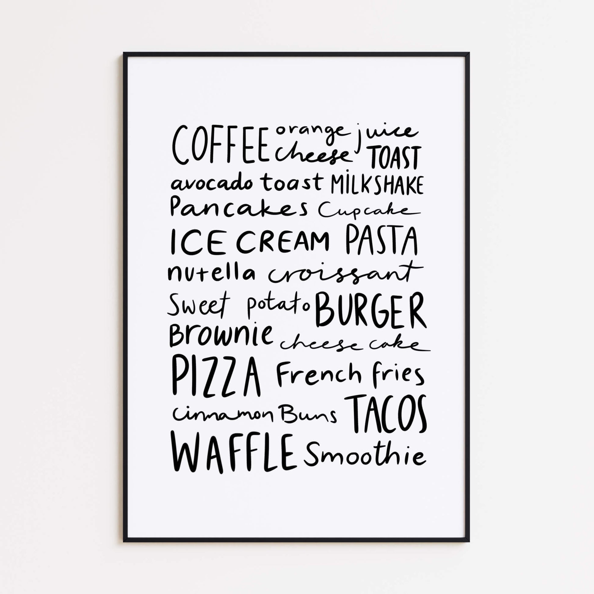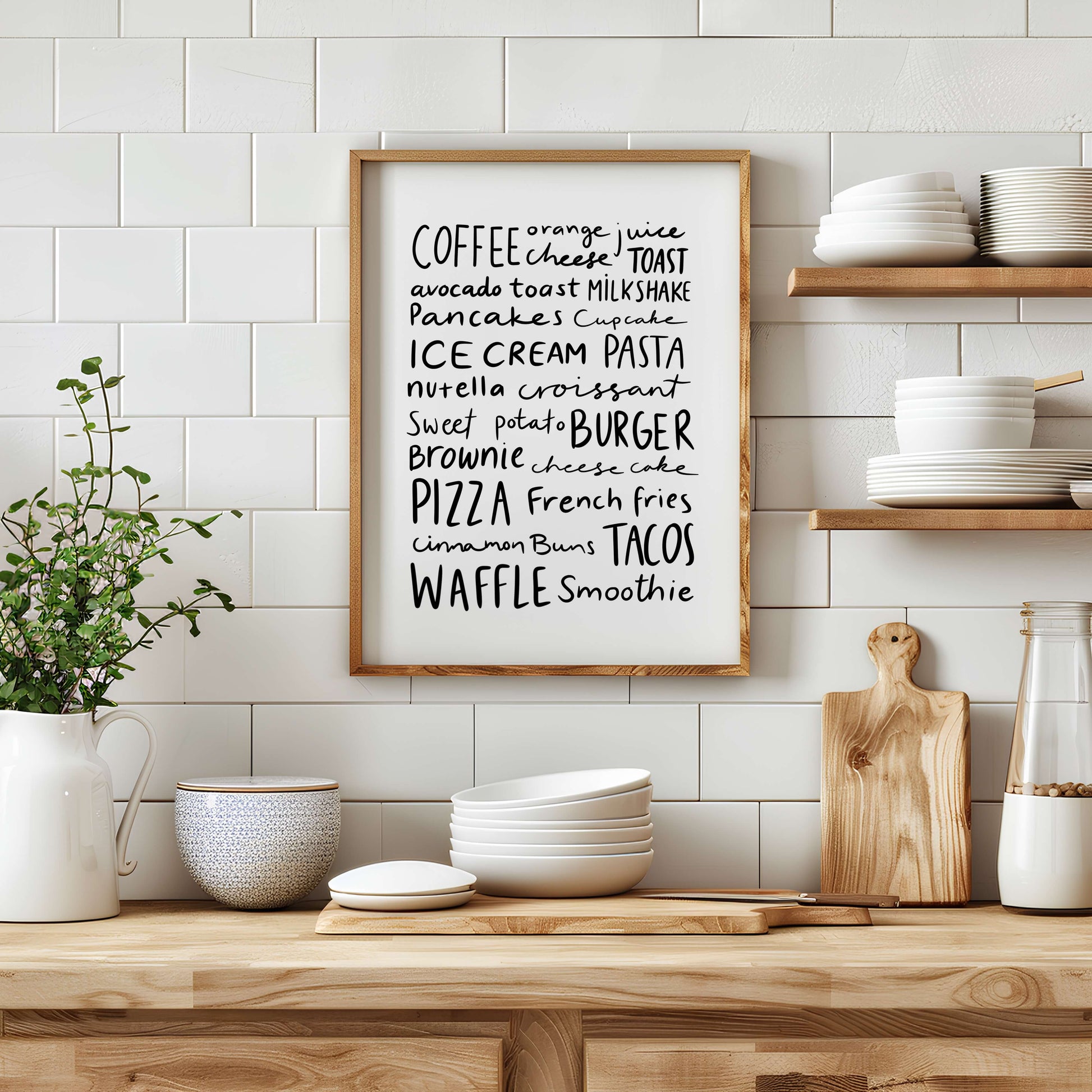 Dieses druckbare Poster zeigt eine verspielte handgeschriebene Liste mit Lieblingsspeisen und -leckereien – von Kaffee und Pfannkuchen bis hin zu Pizza und Tacos. Lustig, originell und voller Persönlichkeit – die perfekte Dekoration für Küchen, Esszimmer oder Cafés.