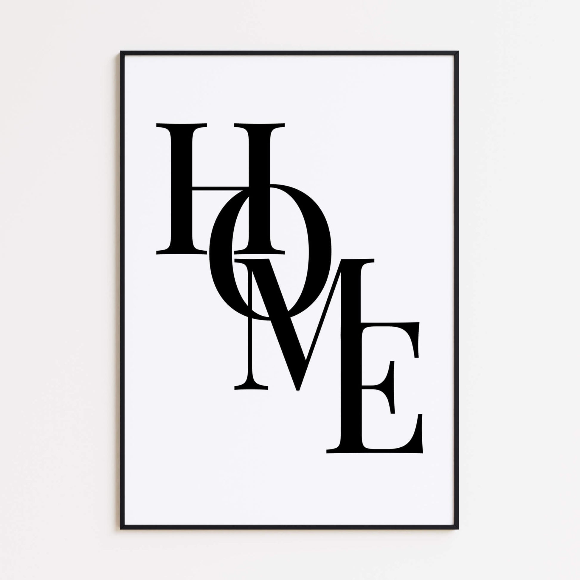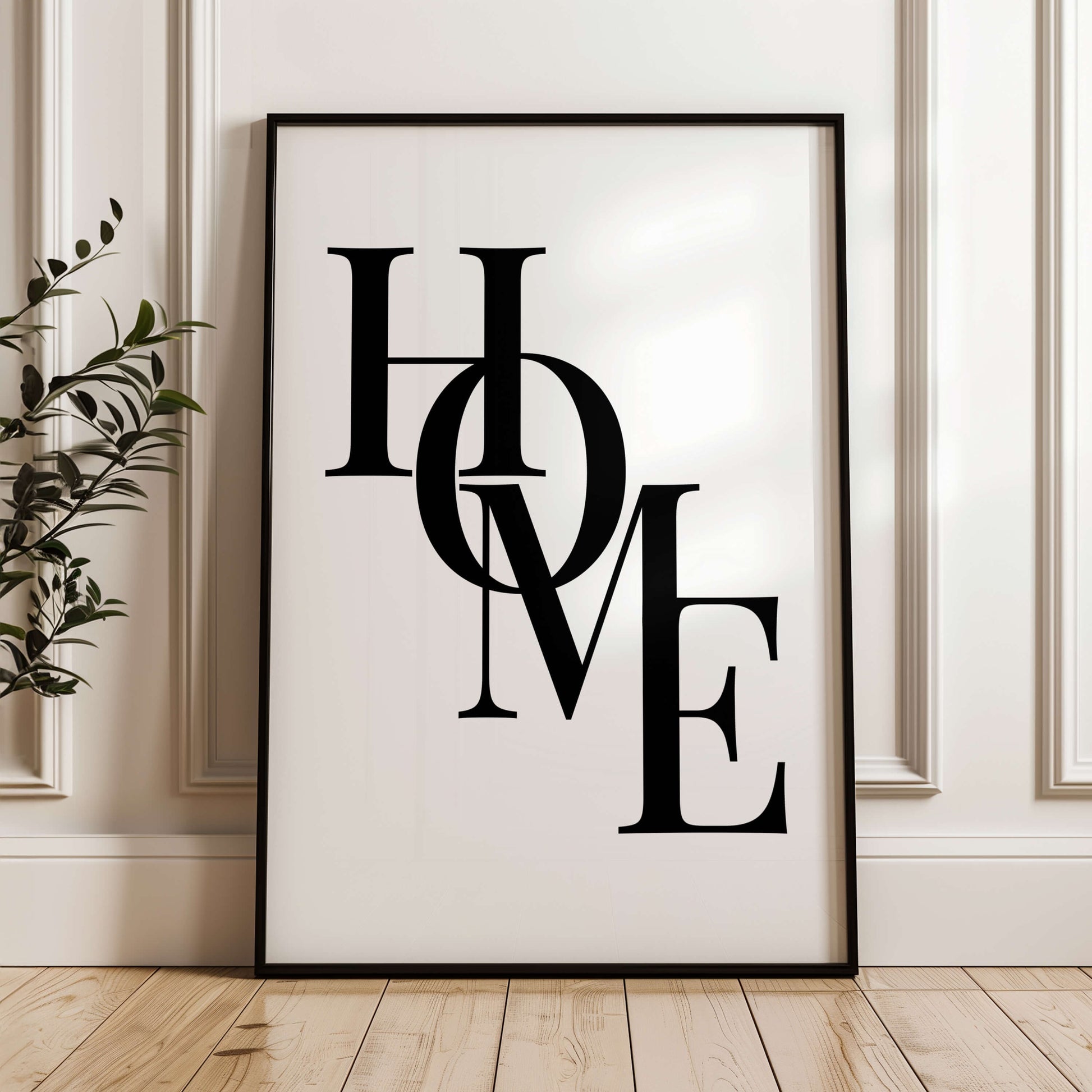 Dieses Poster zeigt das Wort „HOME“ in fetter, überlappender Typografie. Modern und doch zeitlos setzt es ein markantes Statement, das Ihrem Raum Eleganz und Wärme verleiht.