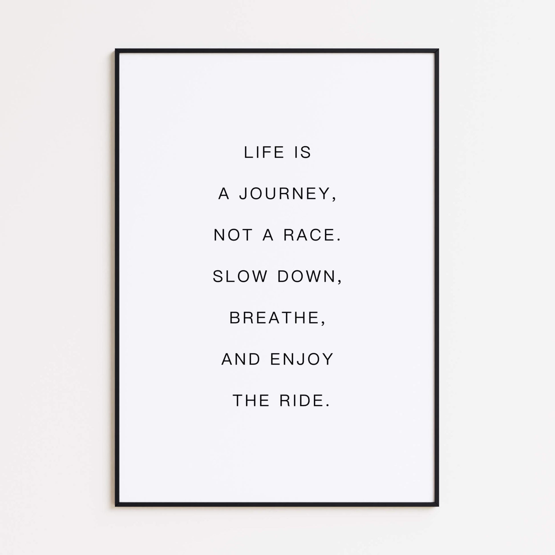 Dieses druckbare Poster vermittelt in moderner Typografie eine beruhigende Botschaft: Das Leben soll in seinem eigenen Tempo genossen werden. Seine einfache, aber nachdenkliche Botschaft macht es ideal, um eine ausgeglichene, achtsame Atmosphäre in Ihrem Wohnraum zu schaffen.
