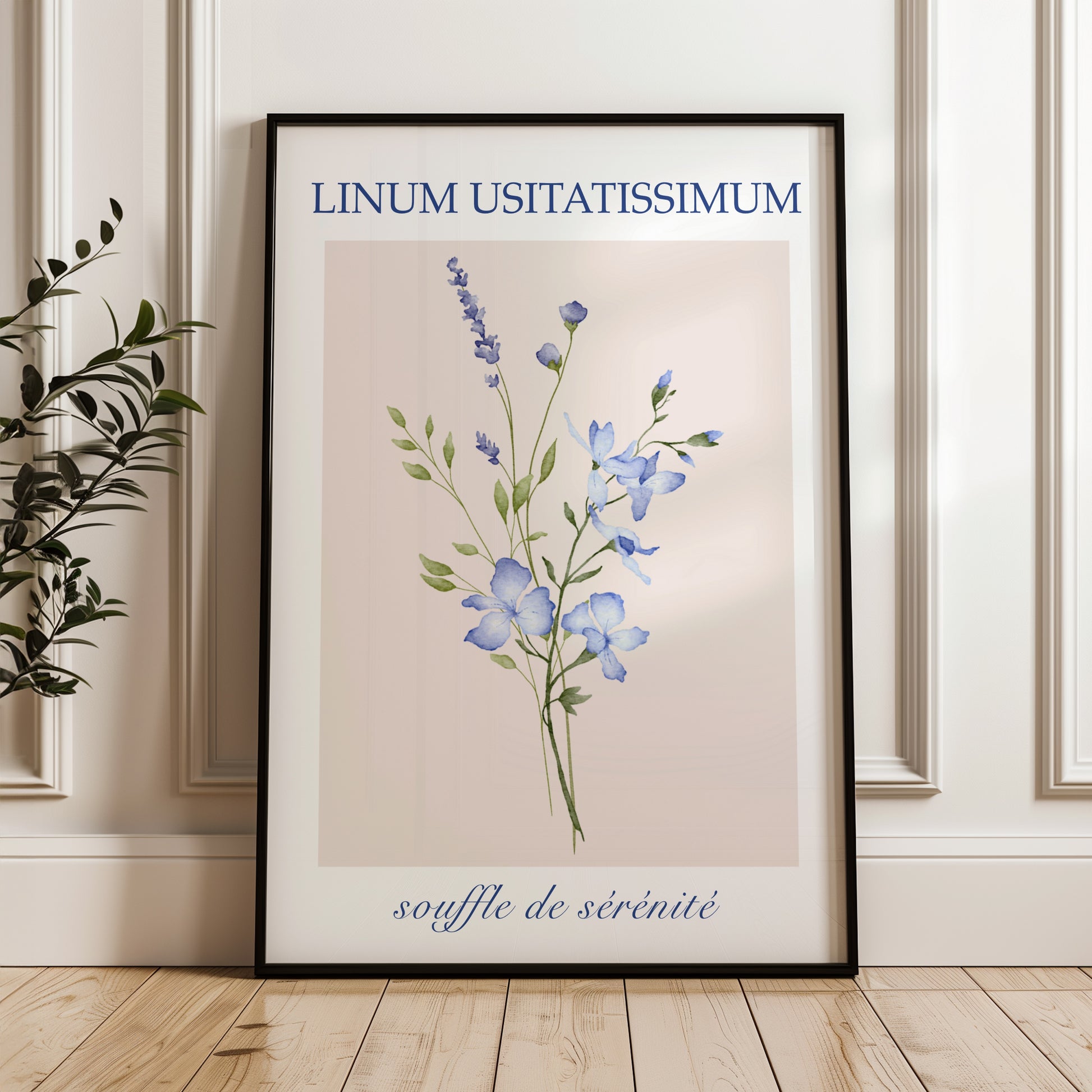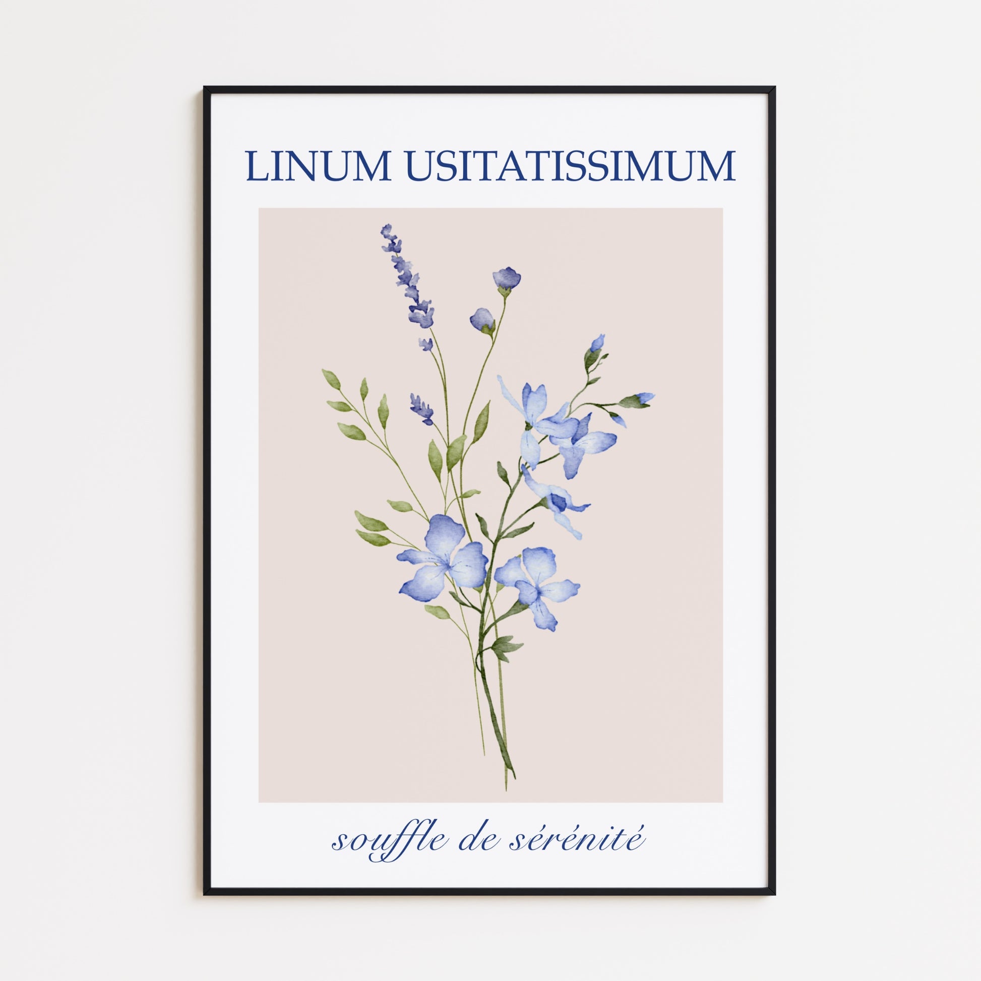 Dieses druckbare Poster zeigt eine zarte Illustration von Linum Usitatissimum-Posterblüten in beruhigenden Blautönen, ergänzt durch zartgrünes Laub. Der französische Text „Souffle de sérénité“ unterstreicht die ruhige und elegante Ausstrahlung und macht es zu einer zeitlosen Ergänzung für jede Wohnkultur.