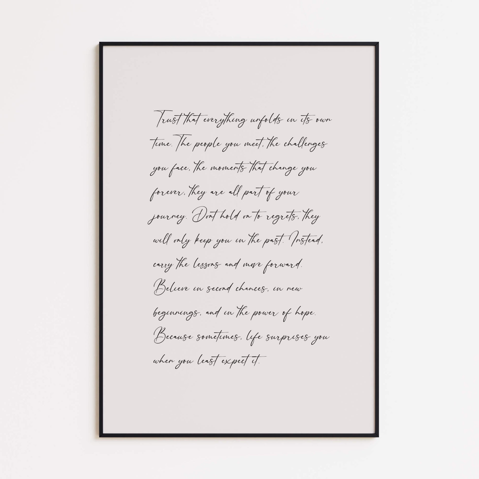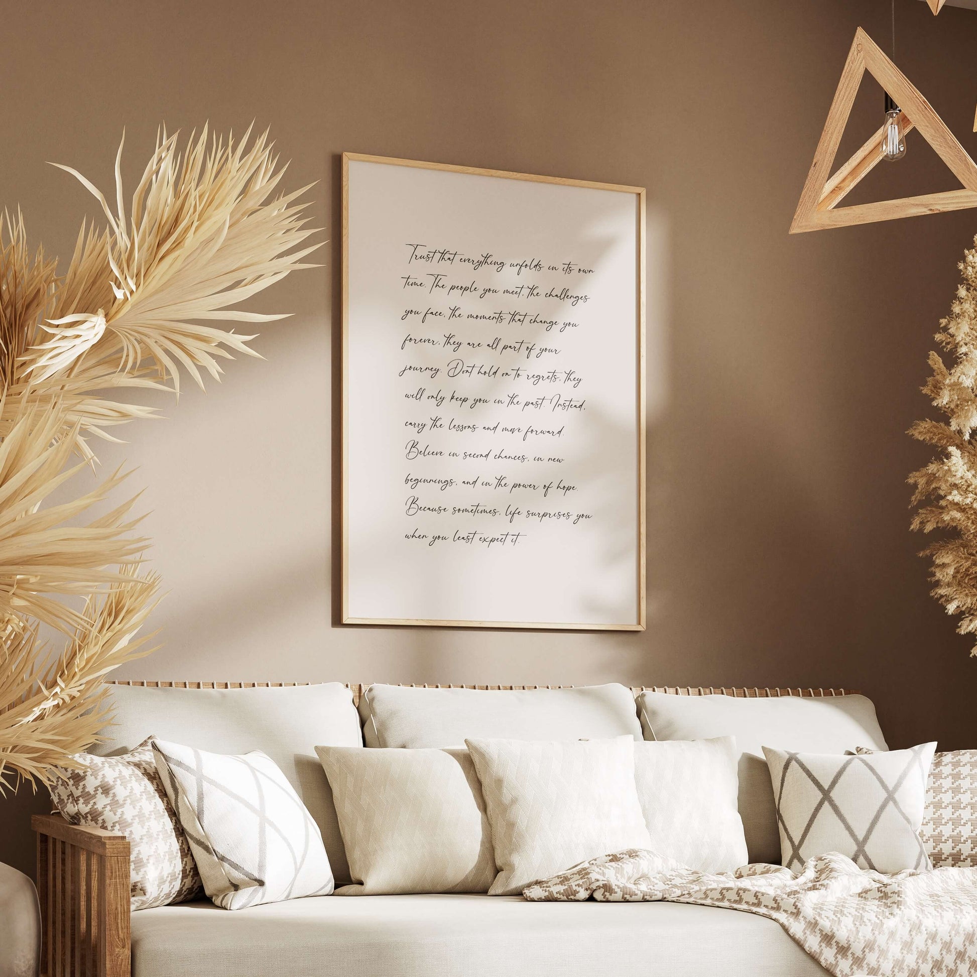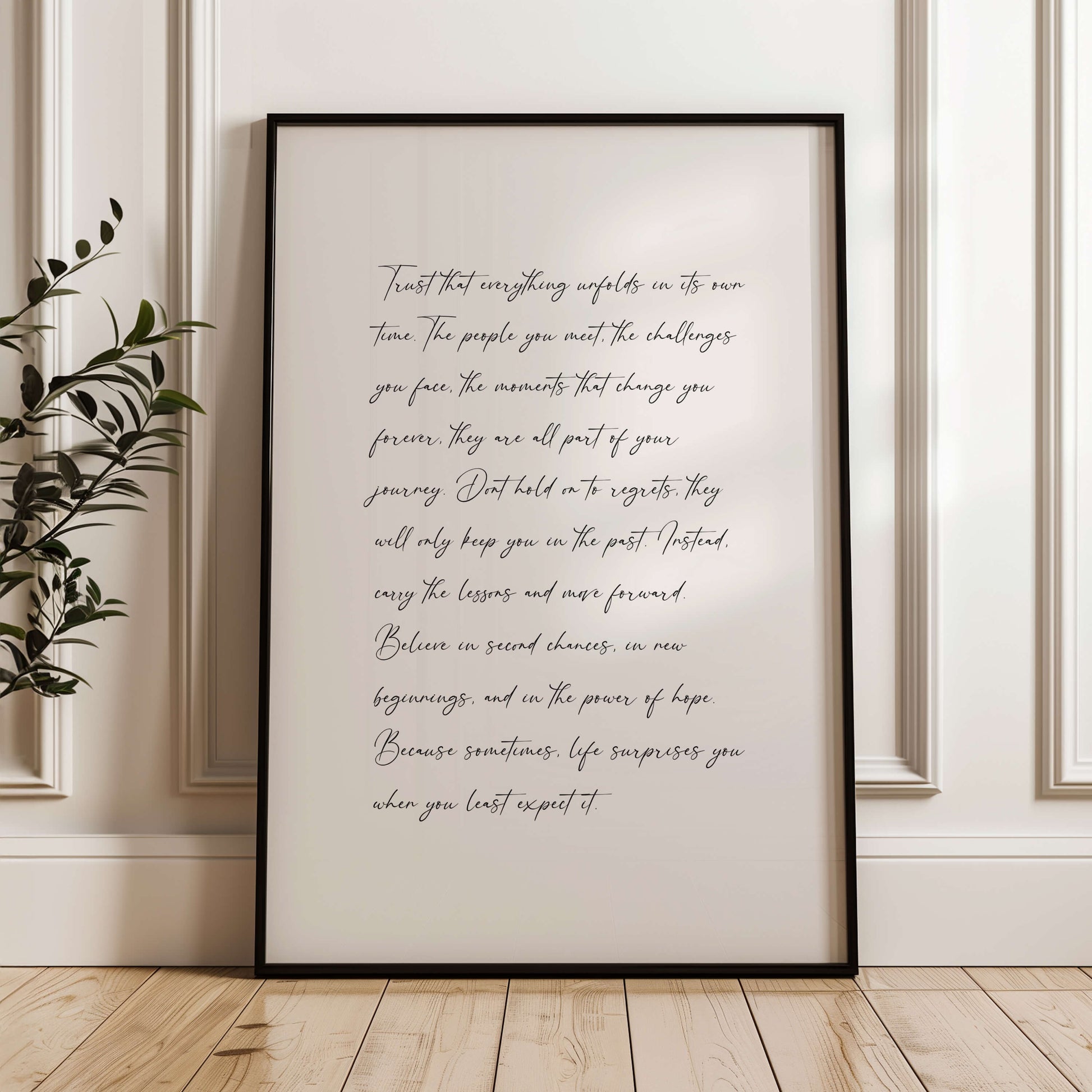 Dieses druckbare Poster zeigt eine inspirierende Handschrift mit Reflexionen zu Wachstum, Resilienz und Hoffnung. Sein poetisches Design vermittelt Tiefe und Ermutigung und dient als tägliche Erinnerung daran, Veränderungen und Neuanfänge anzunehmen.