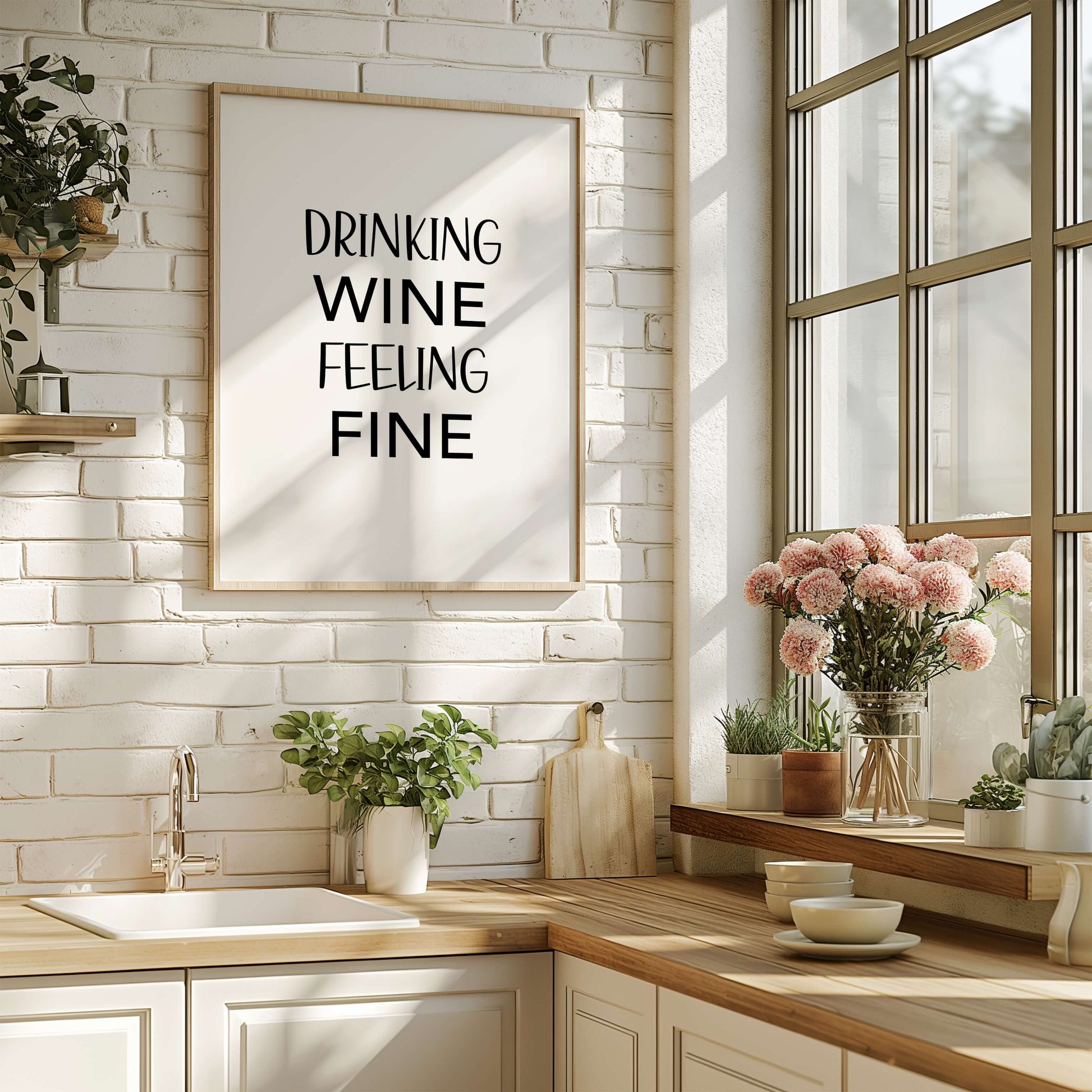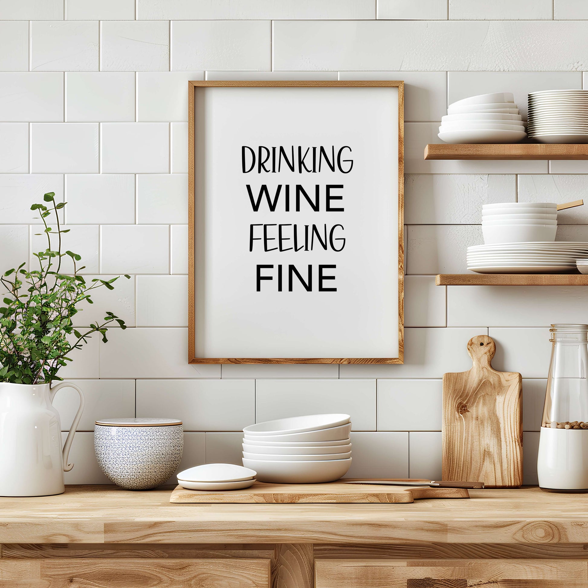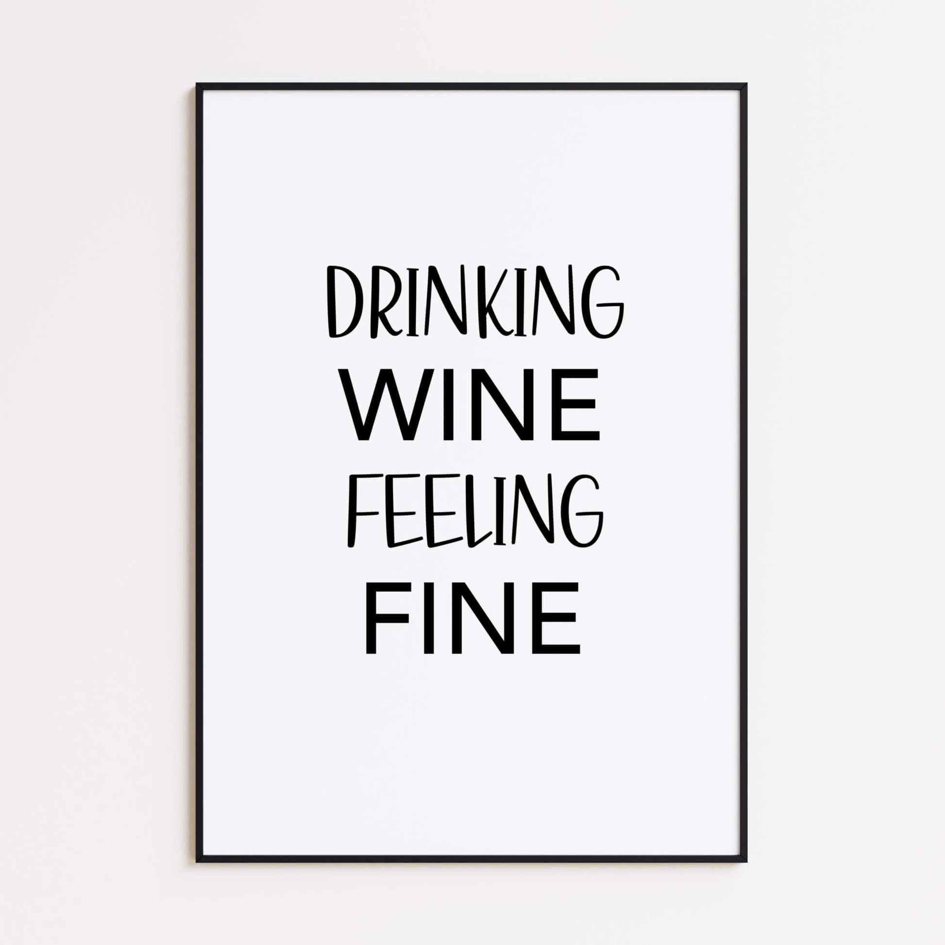 Dieses druckbare Poster vereint Humor und Charme mit dem verspielten Spruch „Drinking wine, feeling fine". Perfekt für Küchen, Essbereiche oder Hausbars, verleiht es Ihrer Einrichtung eine unbeschwerte und gemütliche Note.