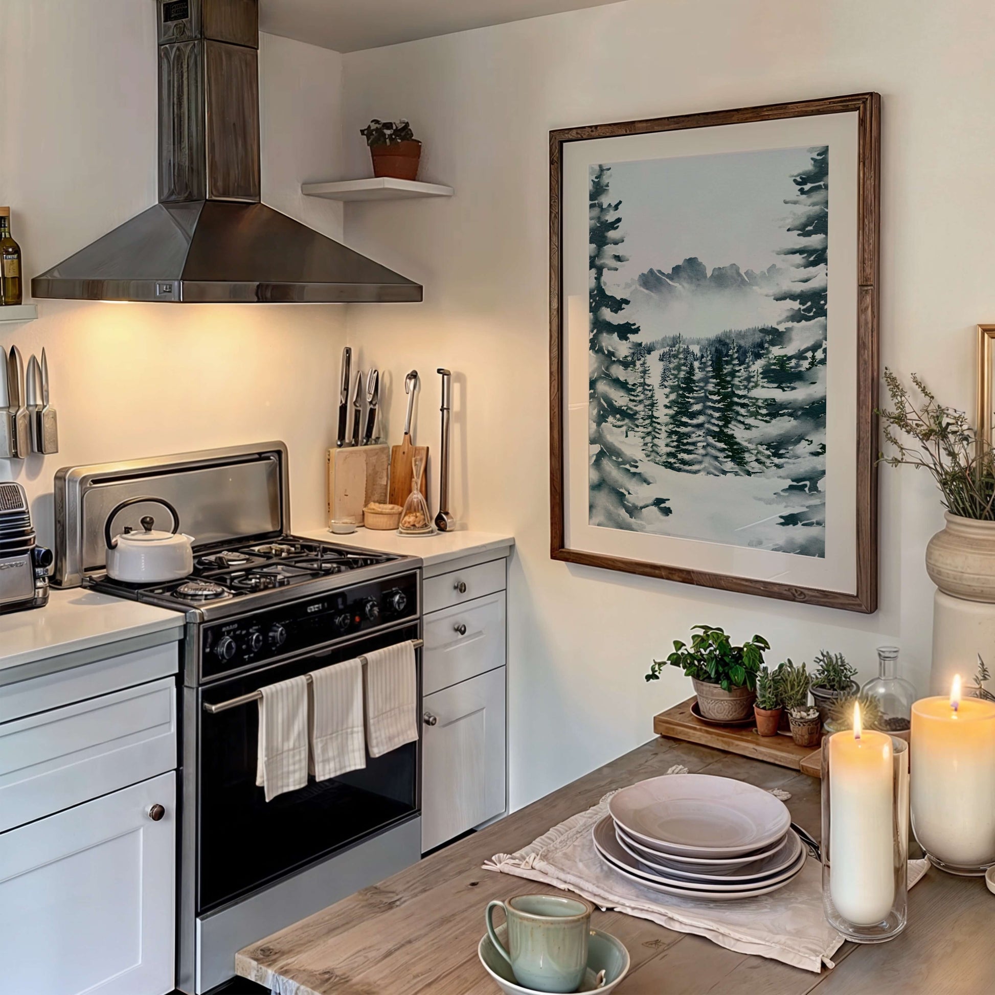 Dieses Poster zeigt eine idyllische Winterlandschaft mit schneebedeckten Tannen und einem nebelverhangenen Berggipfel. Die kühlen Blau- und Grüntöne schaffen eine friedliche, stimmungsvolle Atmosphäre, die jedes Zuhause in einen ruhigen Winterort verwandelt. Ideal, um Wohnbereichen, Eingangsbereichen oder der saisonalen Dekoration einen Hauch winterlicher Eleganz zu verleihen.
