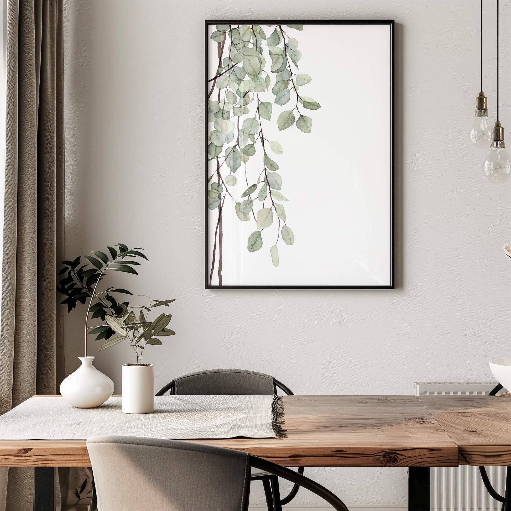 This watercolor poster showcases cascading leave branches in soft, natural hues. Its elegant design complements modern and rustic interiors alike, adding a fresh and organic touch to any room. Combine it with other botanical prints for a cohesive decor theme.